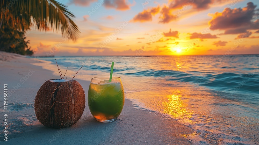 Tropical Beach Sunset With Refreshing Drinks And Palm Wallpaper Mural - Decorly Solutions | Decorly Solutions