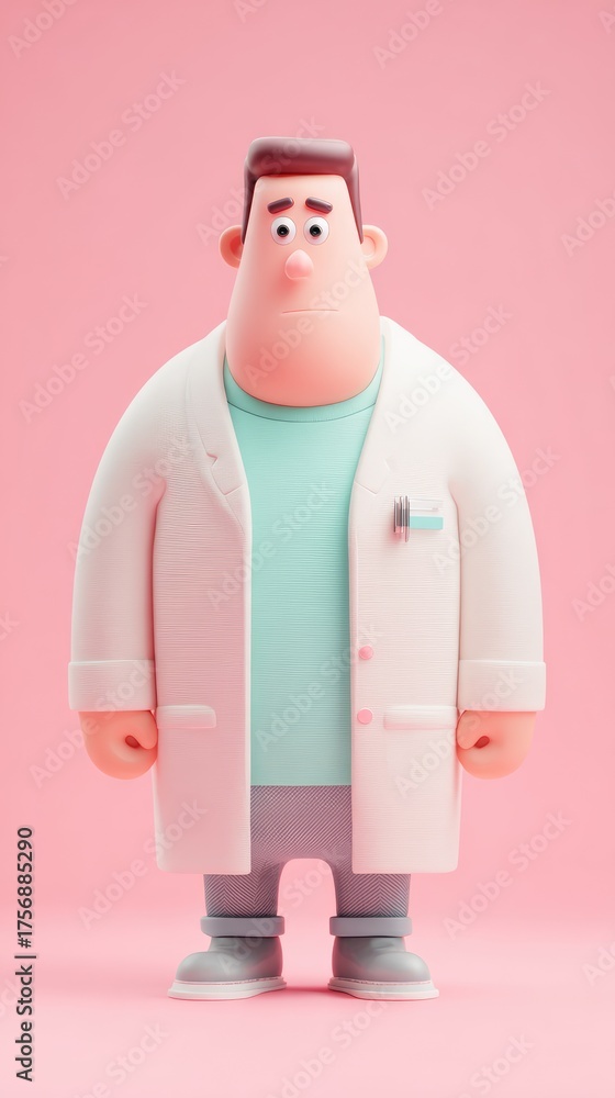 Smiling Doctor Cartoon Character Standing on a Pink Pedestal.