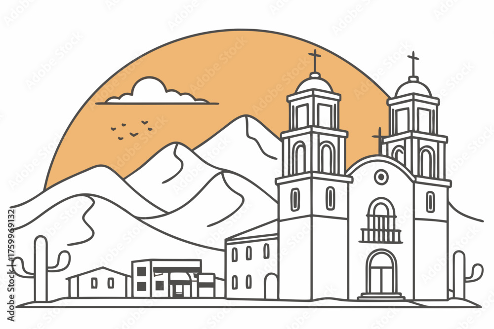 Minimal vector of Santa Fe adobe architecture and sunset tone