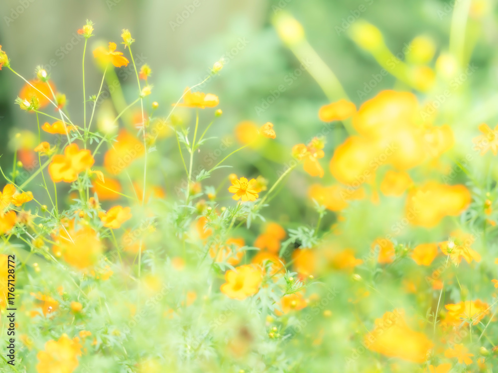 初秋の美しいオレンジ色のコスモス。秋の公園や花壇を彩るキバナコスモスのある風景。自然風景素材。明るい日差しでぼんやりボケたアウトフォーカスの景色。心象風景。 Wallpaper Mural - Decorly Solutions | Decorly Solutions