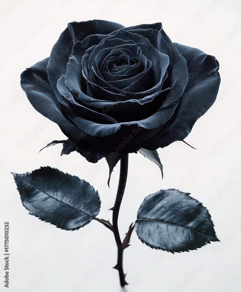 A black rose with dark petals and leaves on a stem