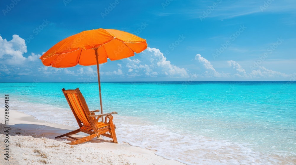 A Vivid Red Beach Umbrella And Matching Chair Placed On A Pristine Sandy Beach Overlooking A Clear Turquoise Ocean Under A Bright Blue Sky