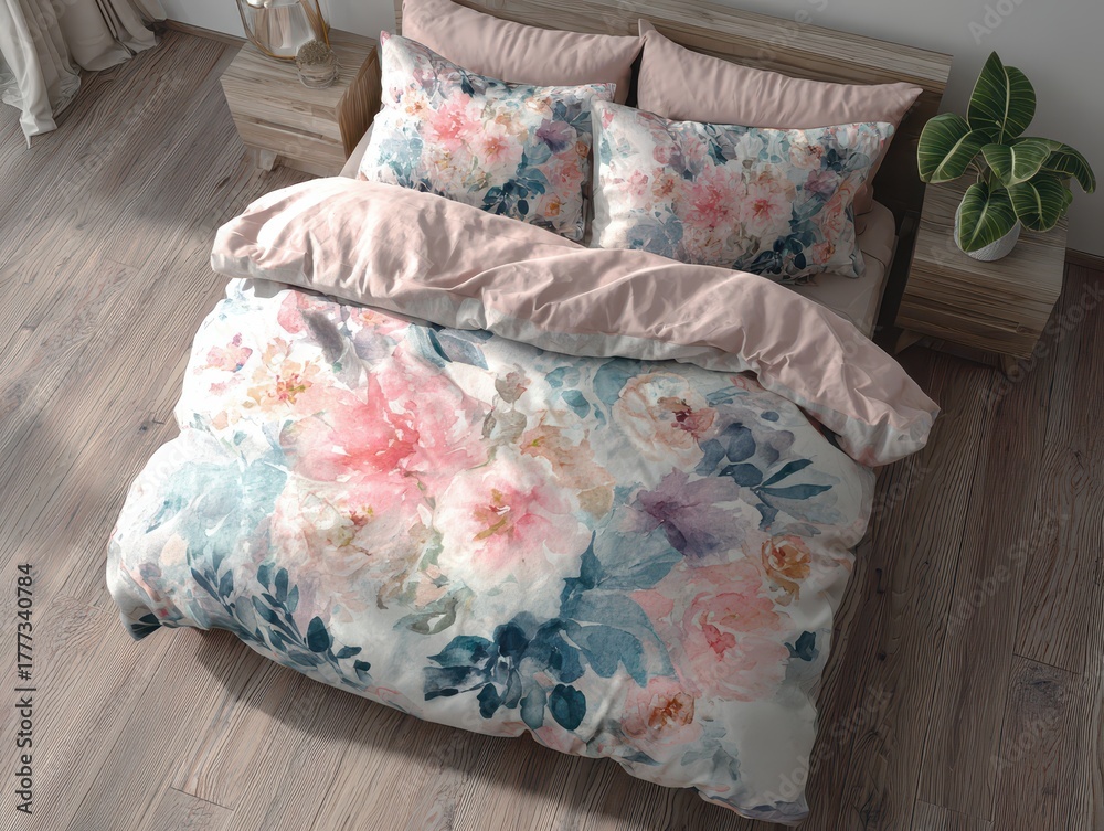 Top-down Shot Of A Beautifully Made Bed Featuring Wallpaper Mural - Decorly Solutions | Decorly Solutions