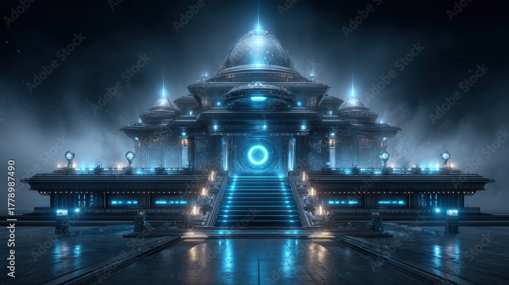 Futuristic Neon Holographic Temple With Intricate Designs And Wallpaper Mural - Decorly Solutions | Decorly Solutions