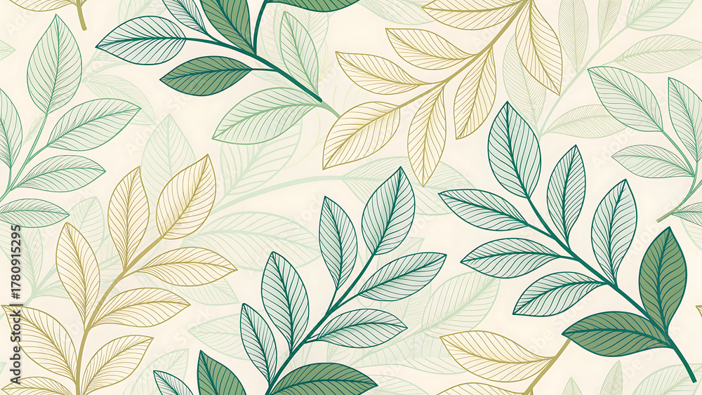 Elegant Leaf Pattern with Delicate Lines and Natural Colors Ideal for Backgrounds and Textile Designs Showcasing Fresh Green and Beige Leaves on a White Backdrop