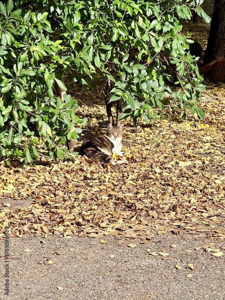 Cat Resting Under Green Bush Surrounded By Fallen Wallpaper Mural - Decorly Solutions | Decorly Solutions