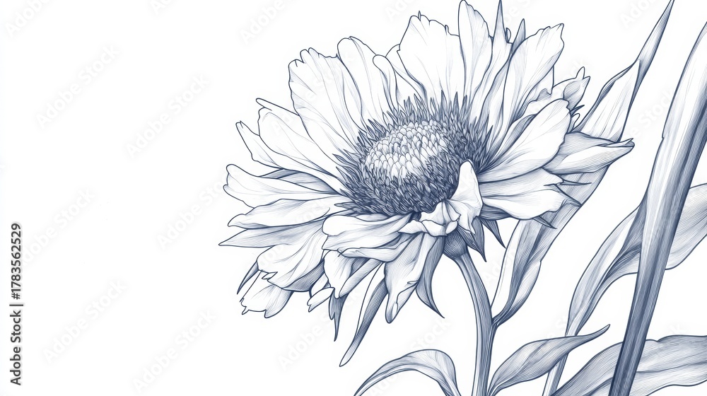 Detailed outline sketch of a chrysanthemum flower with leaves