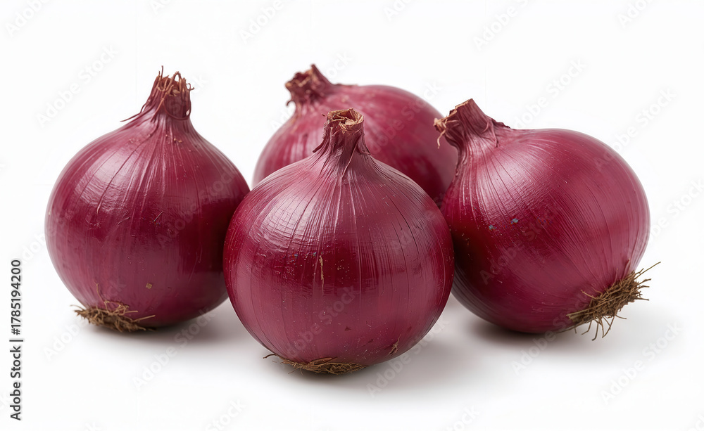 Quattro cipolle rosse fresche su sfondo bianco Generative AI Wallpaper