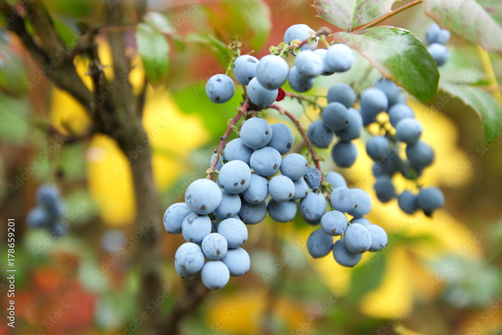 Hollyleaved Barberry, Tall Oregon Grape, Mahonia aquifolium in the botanical garden in autumn