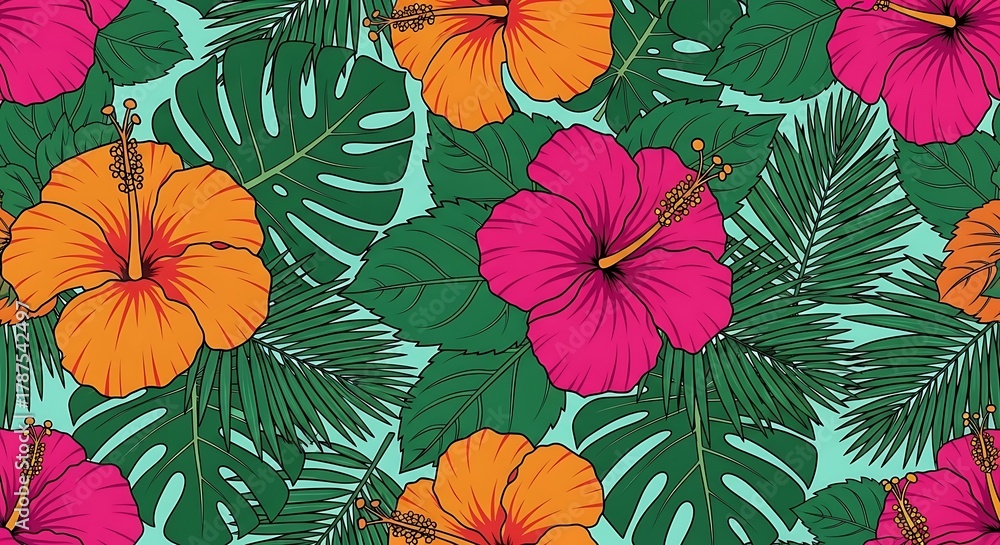 Vibrant Tropical Hibiscus Flowers And Lush Green Monstera Wallpaper Mural - Decorly Solutions | Decorly Solutions