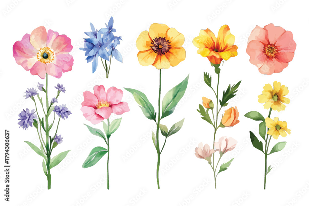 Watercolor Illustration Of Various Flowers Transparent Background Vector Wallpaper Mural - Decorly Solutions | Decorly Solutions