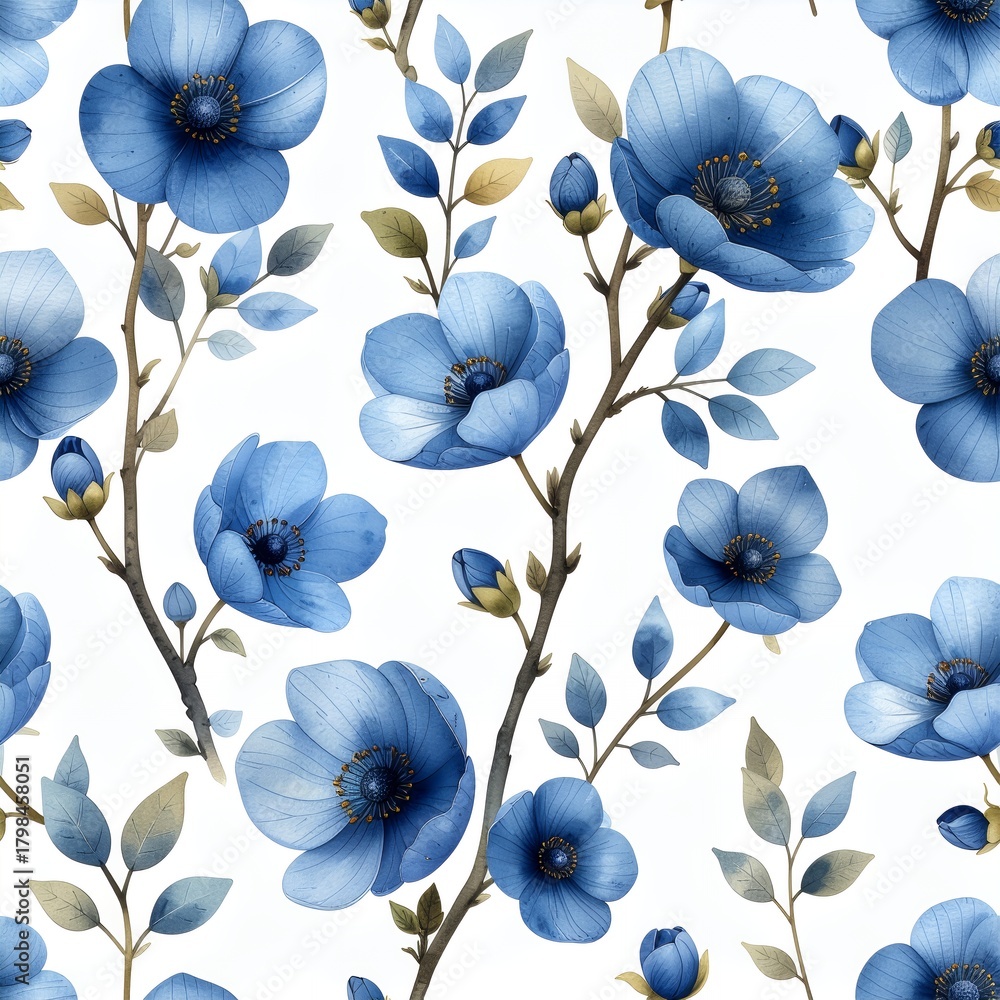 Seamless Pattern with Elegant Blue Anemone Flowers and Delic Wallpaper