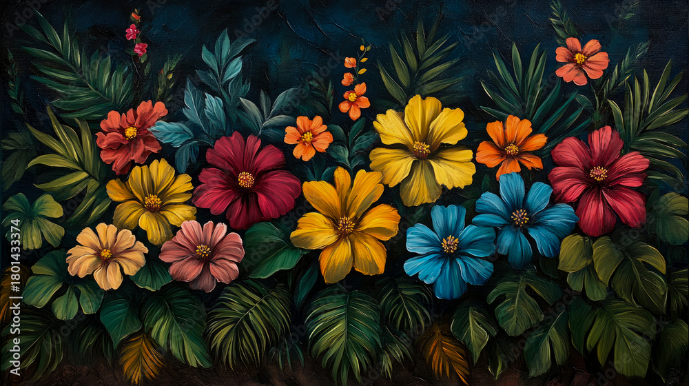 Vibrant Oil Painting Of Lush Tropical Garden With Wallpaper Mural - Decorly Solutions | Decorly Solutions