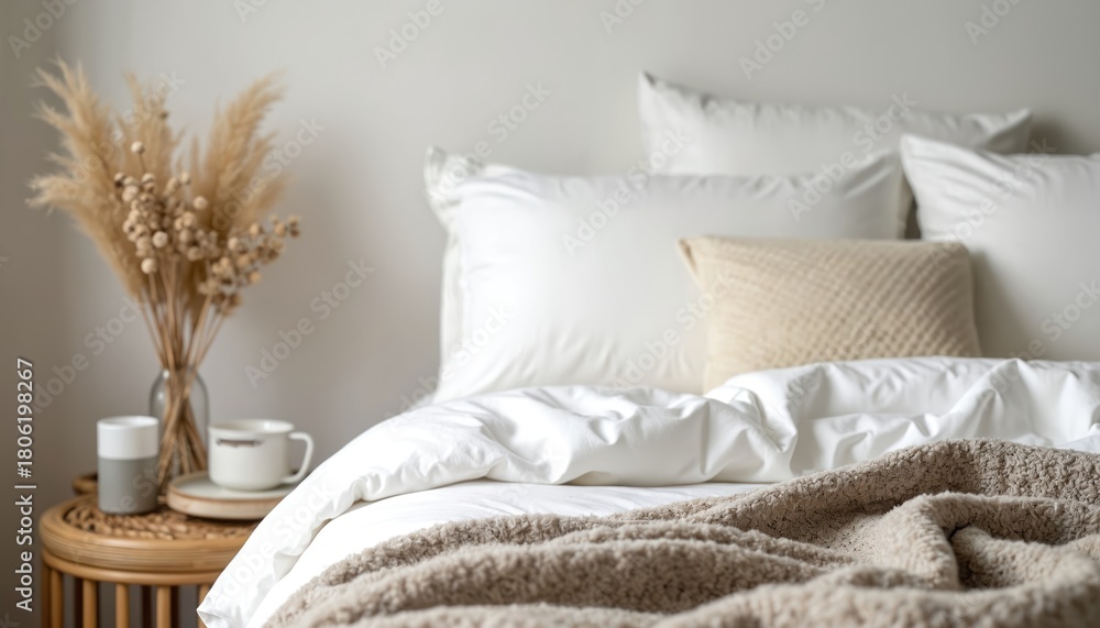 Photo Captures Serene Bedroom Scene White Bedding Contrasts Wallpaper Mural - Decorly Solutions | Decorly Solutions
