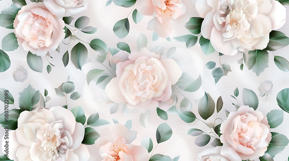 Soft Pink Floral Pattern with Delicate Roses and Leaves in a Light Background for Elegant Designs