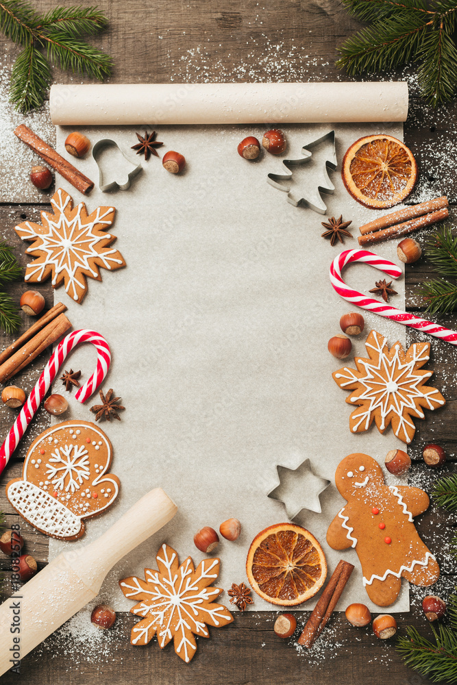 Cute New Year card, frame with gingerbread cookies, cinnamon sticks and fir branches around the perimeter