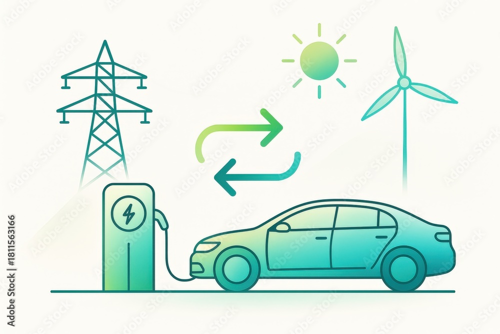 A vibrant illustration showcases smart EV charging with AI scheduling, featuring a blue car and renewable energy icons. Modern, clean design for commercial use.