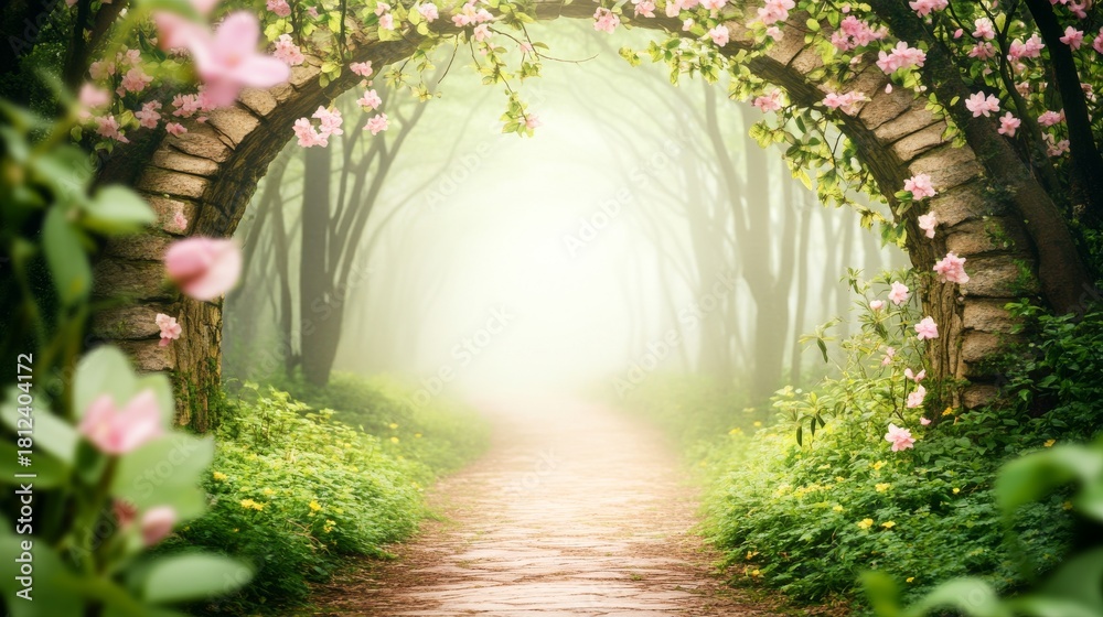 Stone Archway Pink Blossoms Misty Forest Path Fantasy Landsc Wallpaper