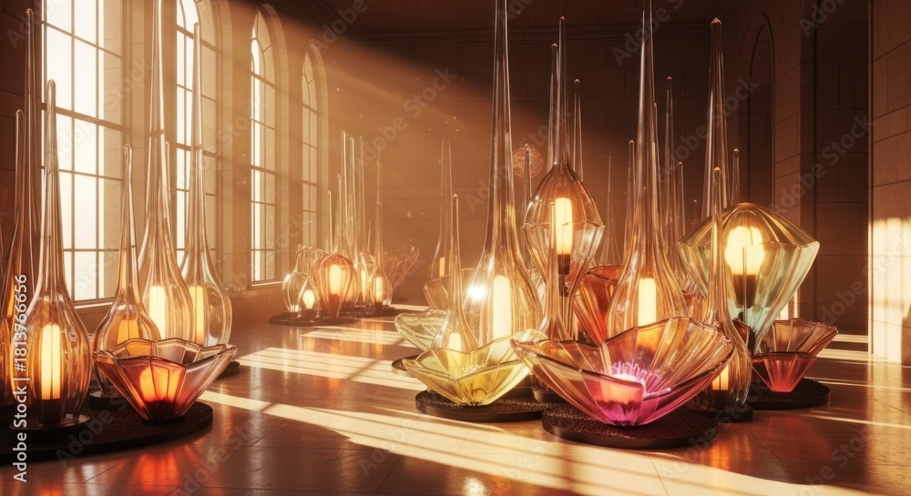 Illuminated Hallway With Golden Light Beams And Stained Glass Ceiling.