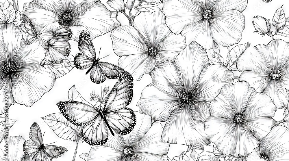 A Black-and-white Illustration Featuring Flowers Surrounded By Butterflies Wallpaper Mural - Decorly Solutions | Decorly Solutions