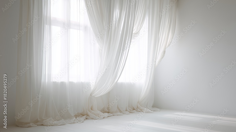 Bright, minimalist interior with sheer curtains, white wooden floor, and decorative white floral branches creating an elegant ambiance.