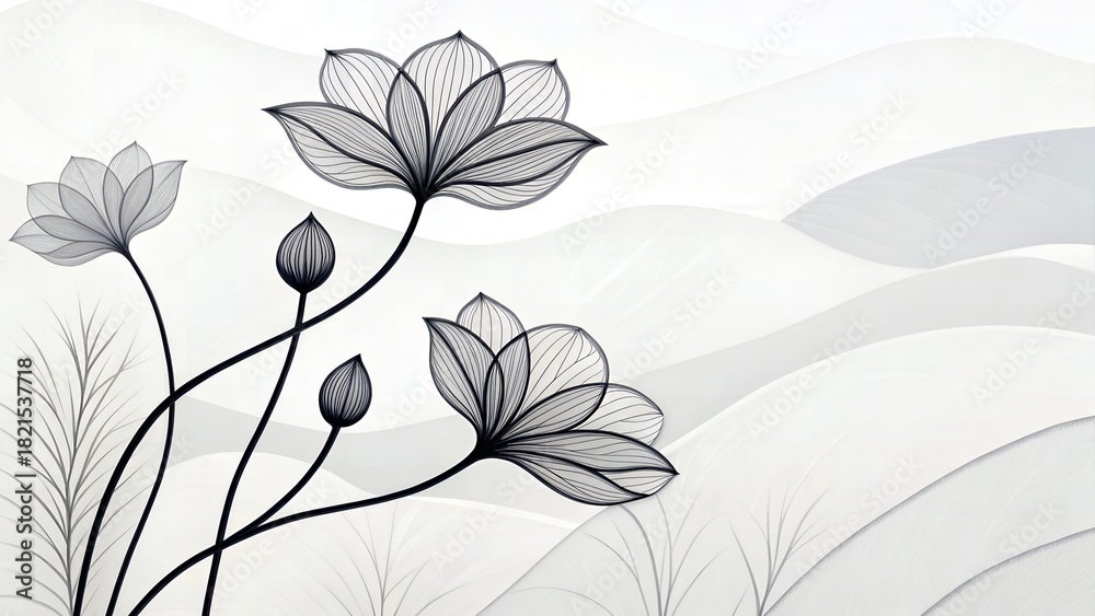 Ink illustration abstract background concept. Elegant black and white illustration of delicate flowers with flowing lines.