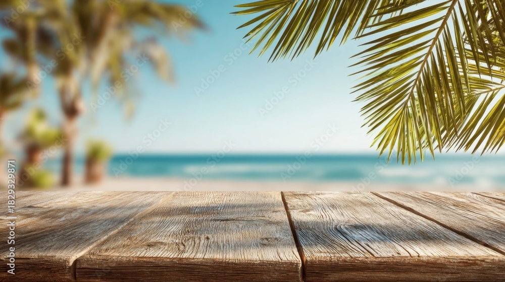 Rustic wooden table surface with a tropical beach blurred in the background, showcasing tall coconut palms and a bright blue sky for a summer vibe.