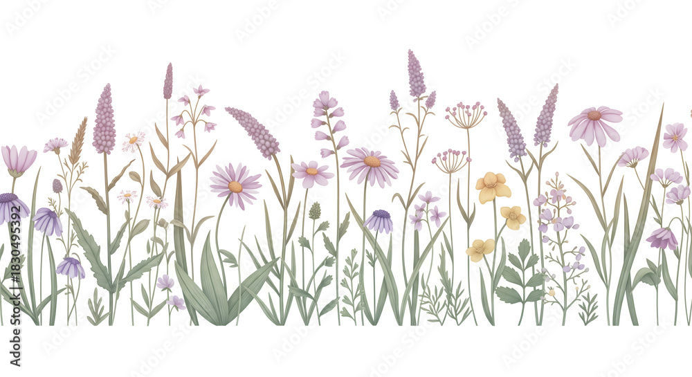 Detailed illustration of various wildflowers, depicting different species in full bloom against a white background.