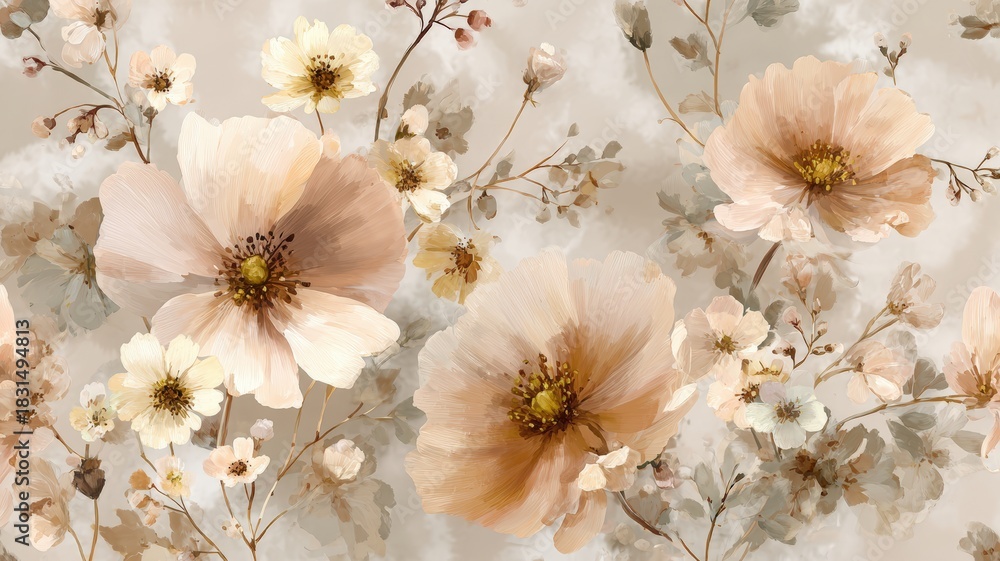 Pastel Beige Canvas Floral Clusters Watercolor Style Soft Bo Wallpaper