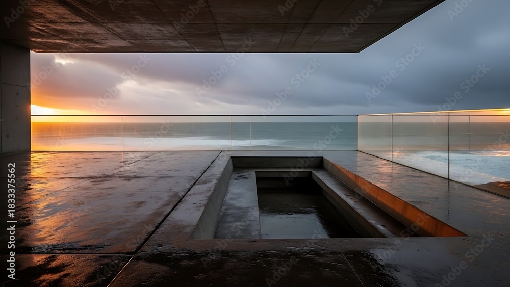 Modern Concrete Patio With Ocean View At Sunset Wallpaper Mural - Decorly Solutions | Decorly Solutions