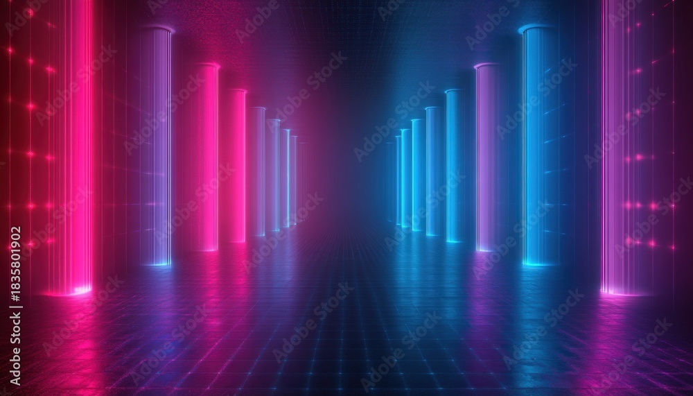 Symmetrical Corridor With Glowing Pink And Blue Neon Wallpaper Mural - Decorly Solutions | Decorly Solutions