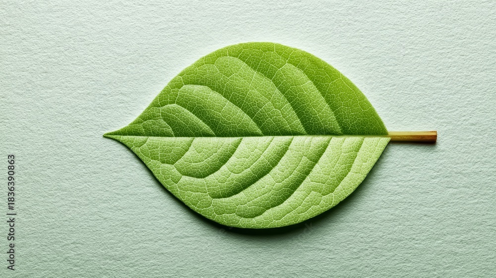 Fresh green leaf with intricate veins resting on a light background, symbolizing nature and renewal