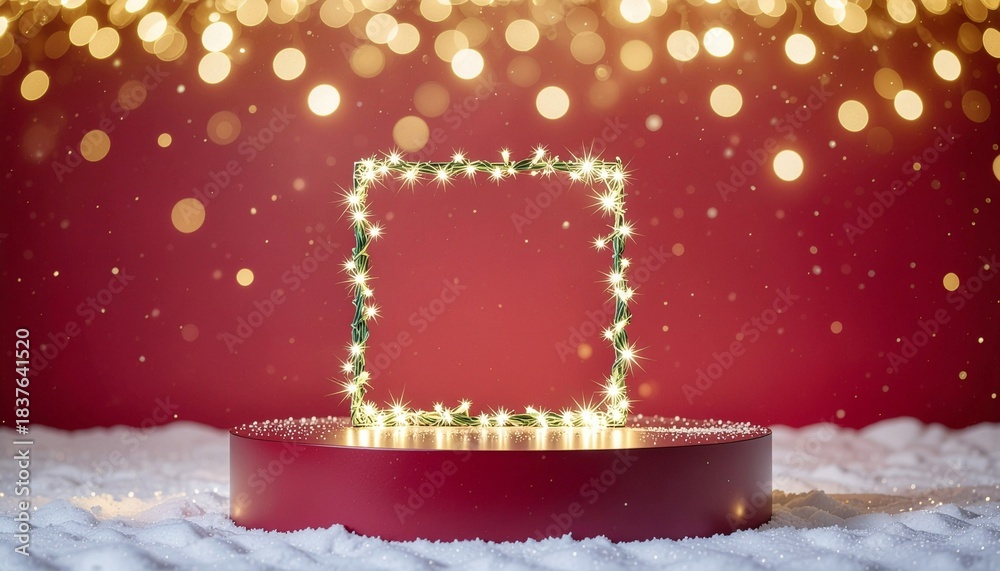 A white round podium and a luminous square frame with Christmas fairy lights.