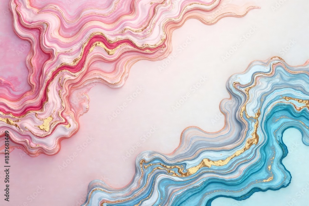 Abstract fluid art background with elegant blue, purple colors. Gold swirls create stylish design. Ideal for modern decor unique fashion concepts. Creative abstract design with wavy lines, pastel