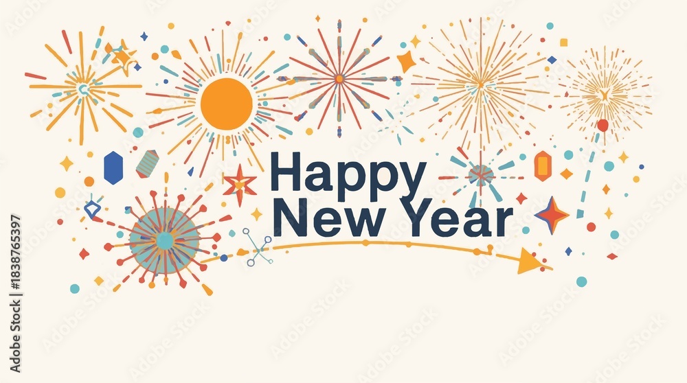 Festive "Happy New Year 2026" text surrounded by colorful, stylized fireworks and swirling graphic elements, celebrating the upcoming year.