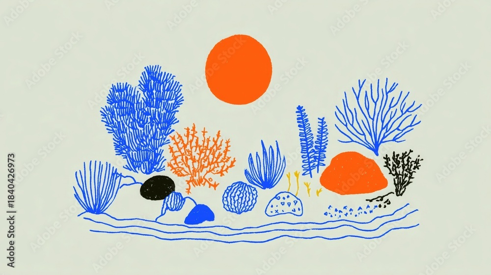 Minimalist Underwater Scene With Blue/orange Coral Seaweed Rocks Wallpaper Mural - Decorly Solutions | Decorly Solutions