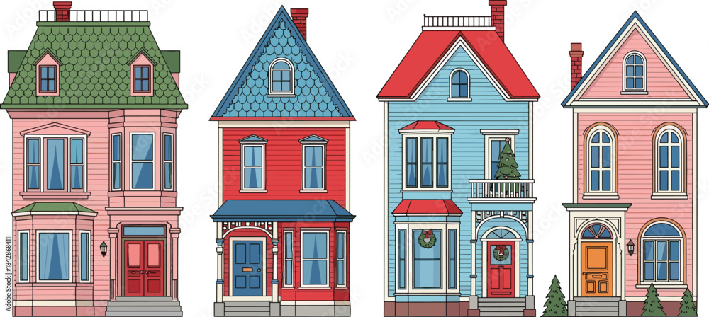 Cartoon Victorian House Set With Festive Decor Wreaths Wallpaper Mural - Decorly Solutions | Decorly Solutions