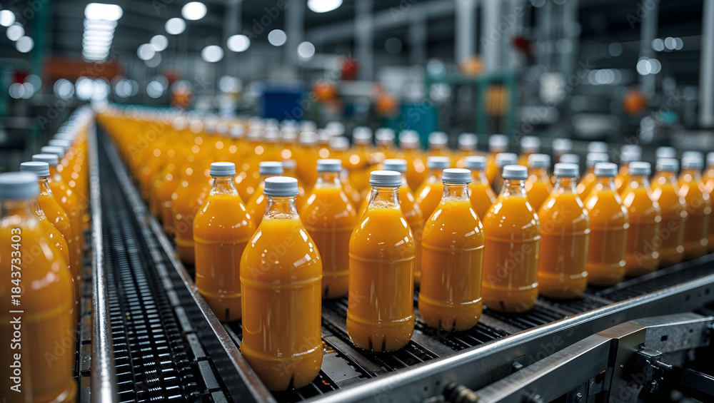 Orange juice bottles conveyor belt factory industrial fresh bright liquid machinery equipment production line generative AI