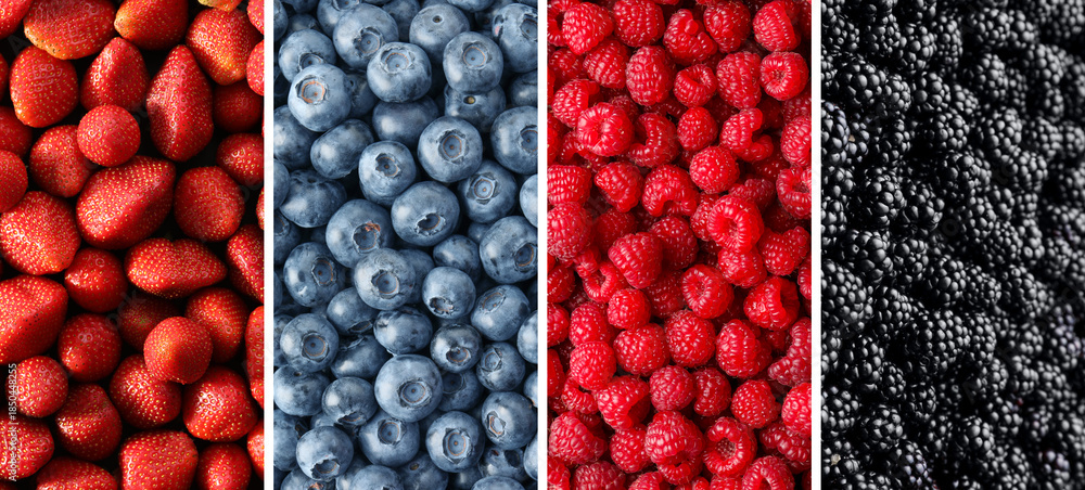 Collage of different fresh berries. Strawberries, blueberries, raspberries and blackberries