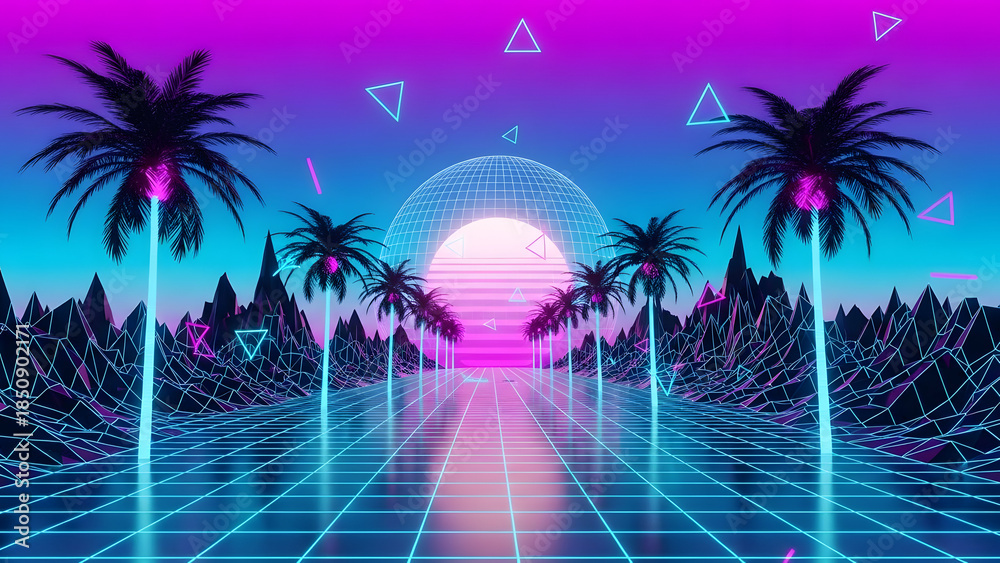 Retro 1980s-style landscape with palm trees, sun, mountains, and futuristic elements, retro, 1980s, background, palm trees