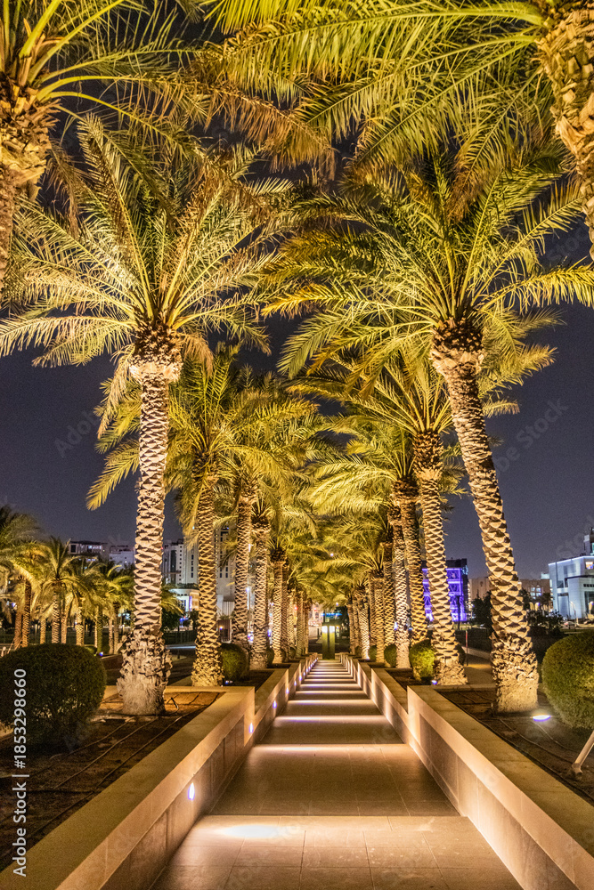 Night view of a palm lined path to the Museum of Islamic Art in Doha, Qatar