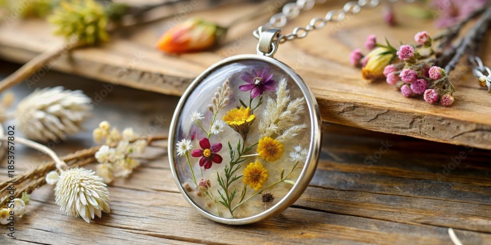 Beautiful Handcrafted Pendant with Dried Flowers on Wooden B Wallpaper