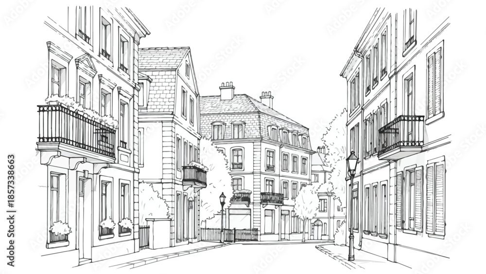 Classic European City Street With Historical Buildings And Street Lamps Sketch