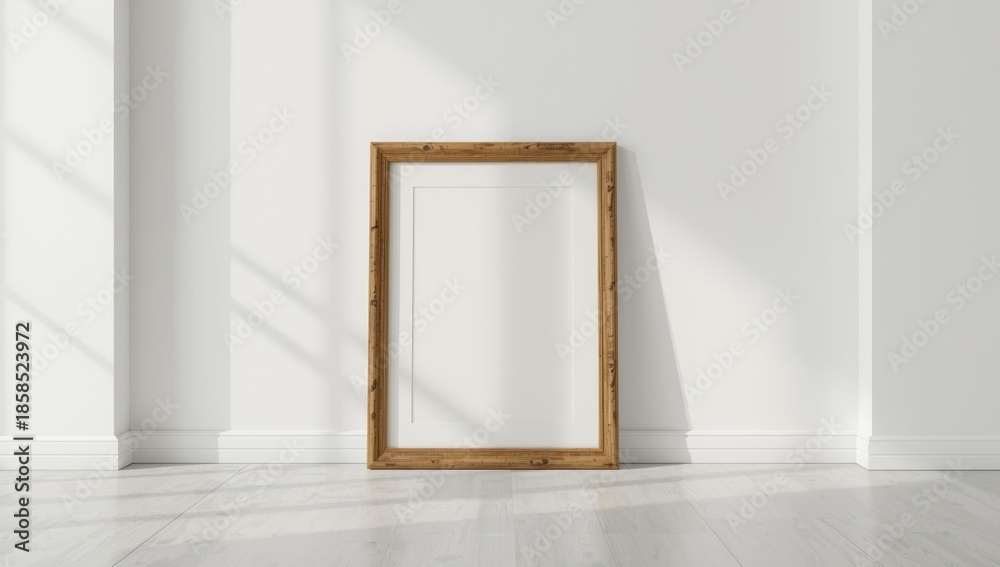 Vertical wooden frame on light wall with soft shadows and copy space, minimalist design