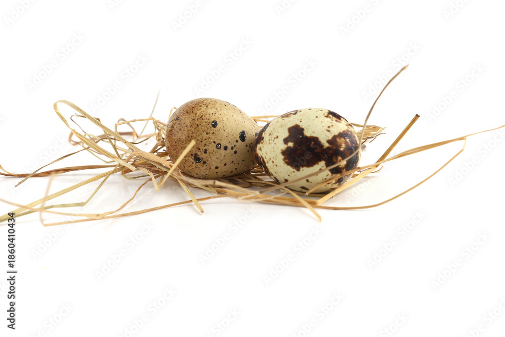Quail eggs on straw isolated on white background Natural pat Wallpaper