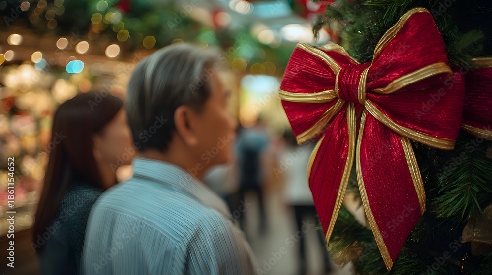 An older couple admires festive ribbon bows and holiday deco ns displayed in a shop window