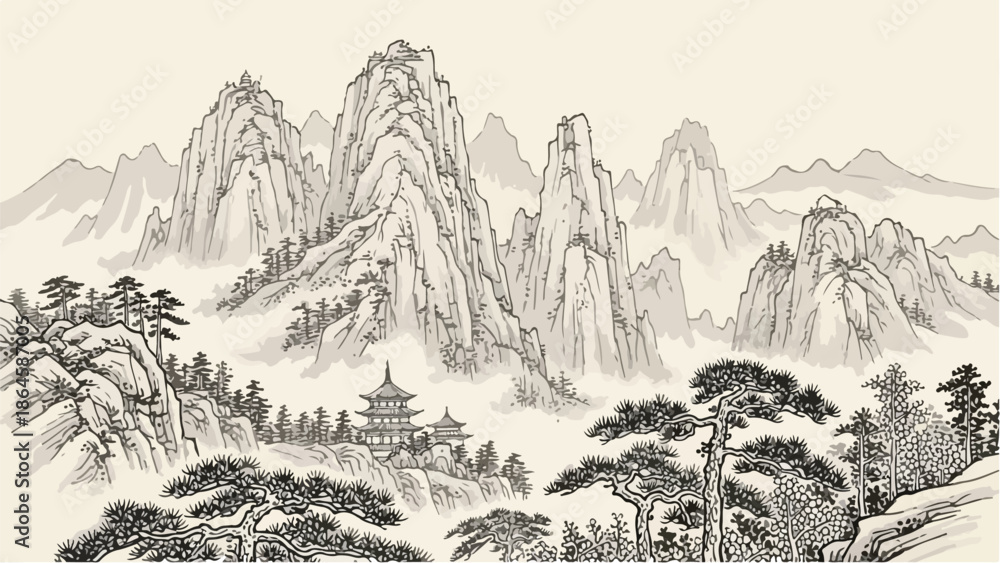 Traditional Chinese mountain landscape painting sketch Wallpaper