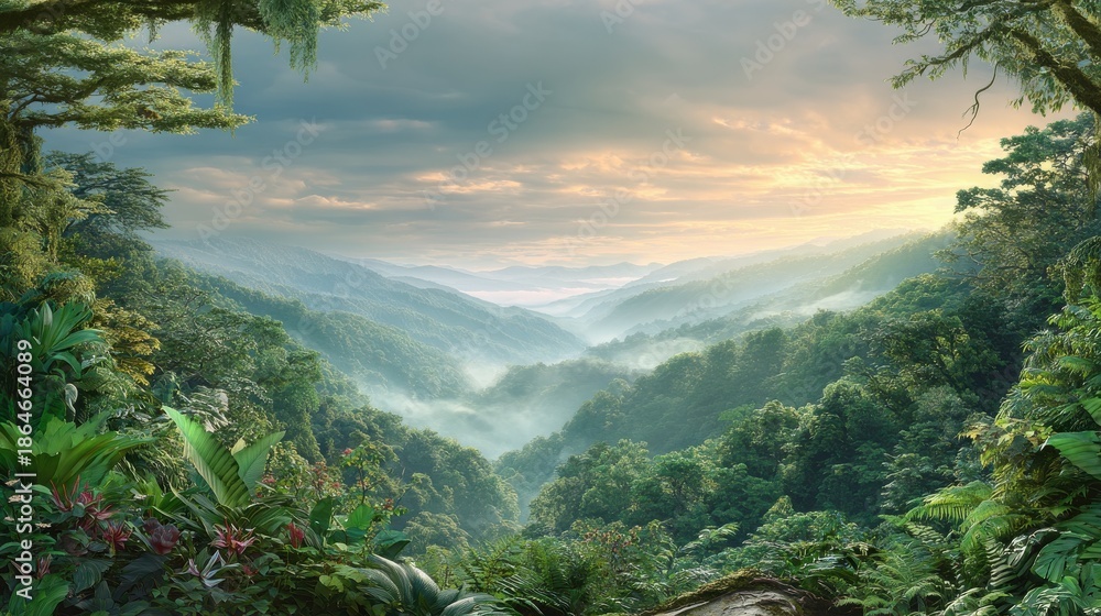 Tranquil birds eye view of foggy jungle setting in the early Wallpaper