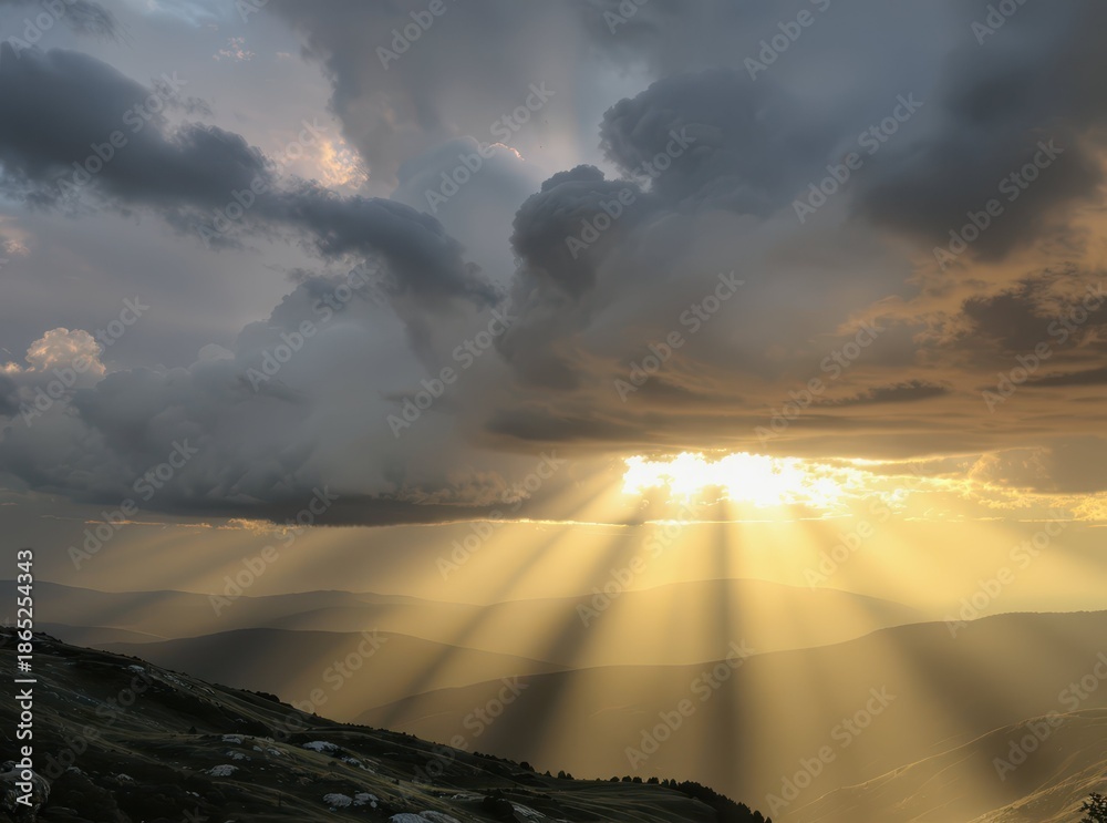 Dramatic landscape of dark storm clouds parting to reveal sun rays breaking through onto distant layered mountain ridges