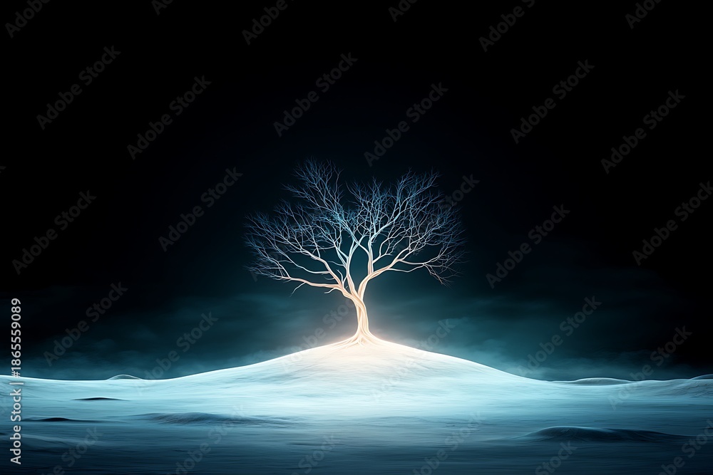 Ethereal Tree Illuminated in Darkness Against a Snowy Landsc Wallpaper